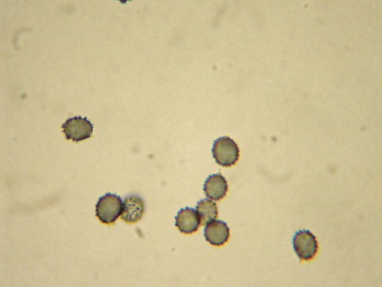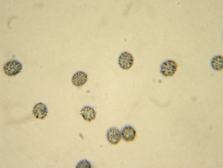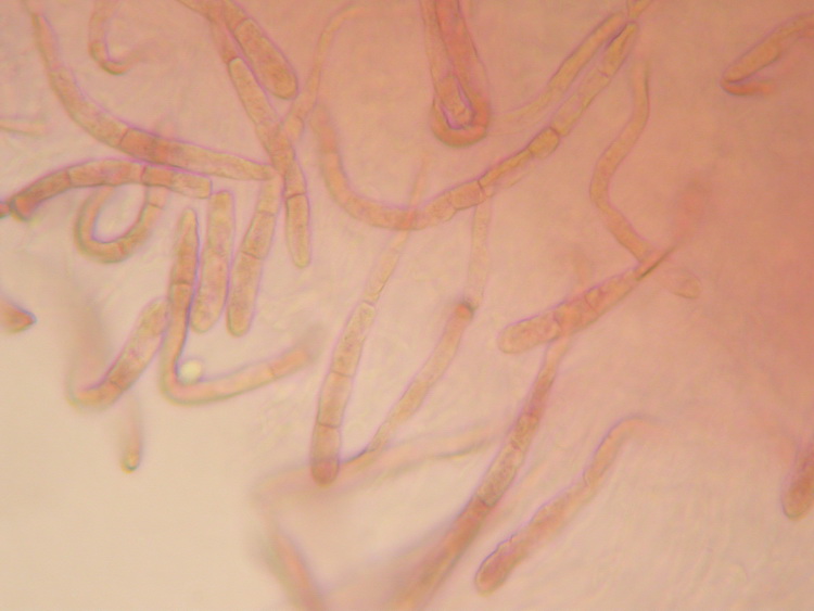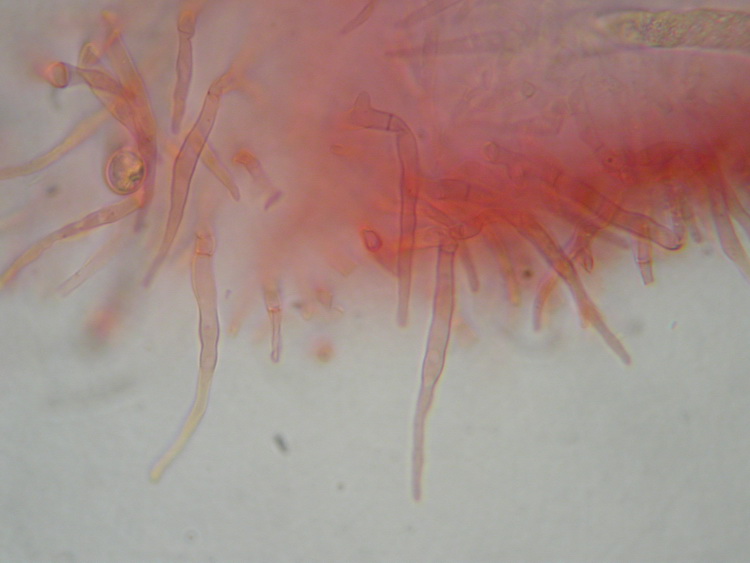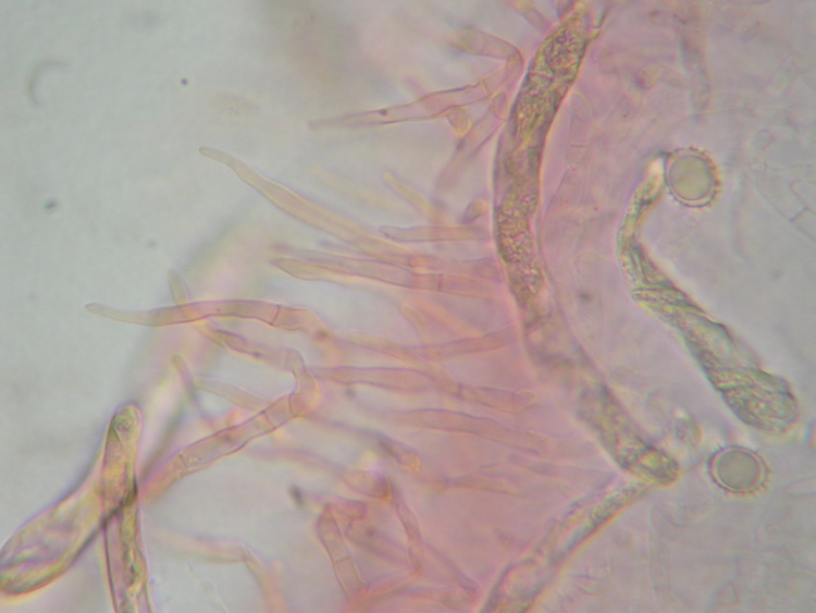 Es handelt sich um einen höllisch scharfen Ockersporer mit isoliert warzigen Sporen und mehrfach septierten Pileozystiden in der HDS. Beim Versuch, die Teile zu schlüsseln, lande ich bei einer Russula badia mit etwas zu hellem Sporenpulver und etwas zu kleinen Sporen. Aber kann R. badia so aussehen? Ich kenne sie viel intensiver gefärbt und kompakter. Bescheibung und Mikros: Funddaten: 06.08.2008, MTB 8136-4-3-1, 750 m, Warngau, Taubenberg, Sulzgraben; Bergmischwald; bei Fichten, Tannen und (weiter entfernt) jungen Buchen; gesellig; Hut: bis 8 cm breit, Mitte vertieft, Rand bisw. kurz kanelliert, deutlich bis schwach glänzend, Farben fleischbräunlich, rötlichbraun, im Zentrum stellenweise schwarzbraun, Rand oft ockerbräunlich verblasst; Stiel: bis 7,5 x 2,7; zylindrisch bis spindelig, basal zugespitzt und schwach braunfleckig, weiß; Lamellen: abgerundet angewachsen, gedrängt, spröde, cremefarben; Fleisch: kompakt (Stiel hohlgefressen) weiß, im Schnitt unveränderlich; Geruch: angenehm obstartig (Birne); Geschmack: Lamellen brennend scharf, Fleisch: scharf; Chemie: (Reaktion auf Hutfleisch) FeSO4: sofort blassrosa; Guajak: mäßig rasch blaugrün; Phenol: langsam violett (keine Brauntöne beigemischt); HDS: Haare: lang, dünn, fädig, glatt bis leicht wellig, wenig verzweigt, TZ immer zur Spitze verjüngt, Enden oft spitz, Maße an den Septen ca. 2-4 µm, Pigment unauffällig; Pileozystiden lang (oft >100), plurisettati (ca. 1-4 Septen), zylindrisch-schlangenförmig, Endzellen bisw. auch keulig, Köpfe ca. 6-10 breit, auffallend marmoriert (siehe Fotos in Wasser), in SV (beim Exsikkat) nicht reagierend; Sporen: breitellipsoid, 7,7 x 6,6 (7-9 x 6-7,5), Q=1,17 (1,08-1,23), 20 Sp. gemessen; Ornamentierung: isoliert warzig, Warzen stumpfkeglig und grob, bisw. verlängert und zu kurzen Graten verbunden, seltener dünne Stege vorhanden, keine netzigen Verbindungen oder Maschen, ca. 1 µm vorstehend; Plageflecken relativ klein und mäßig amyloid (grau); Sporenpulver: (trocken) IIIa-b; Haare in Kongo: