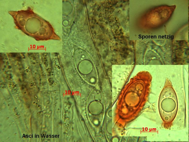 Hallo zusammen, Gelbfieber hat ja schon die Sporen vorgestellt. Hier ein Bild mit Sporen eines einzigen Bechers, in verschiedenen Altersstufen und Präparaten. Kein Wunder, wenn da oft nicht alles so klar im Artkonzept ist! Viele Grüsse, Markus