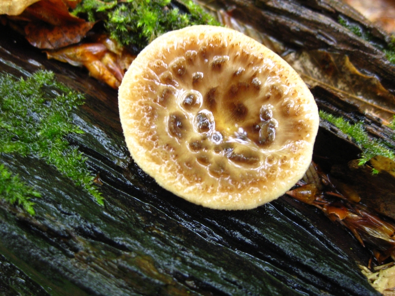 Ja, ihr Lieben, den hatte ich noch vergessen: Gestern bei Regen auf einem liegenden Stamm (vermutlich Buche) wuchs er. Ist es der Kleine Schuppenporling? Wenn nicht, was dann?