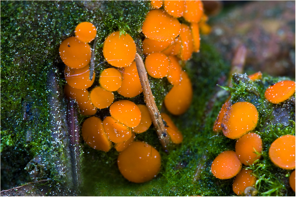 diese kleinen Becherlinge (?), Durchmesser ca. 1-2mm fand ich heute massenhaft auf einem moosbewachsenen Steinhaufen in einem Fichten-/Kiefernwald. Kann mir bitte jemand einen Tipp geben, um was es sich handeln könnte?