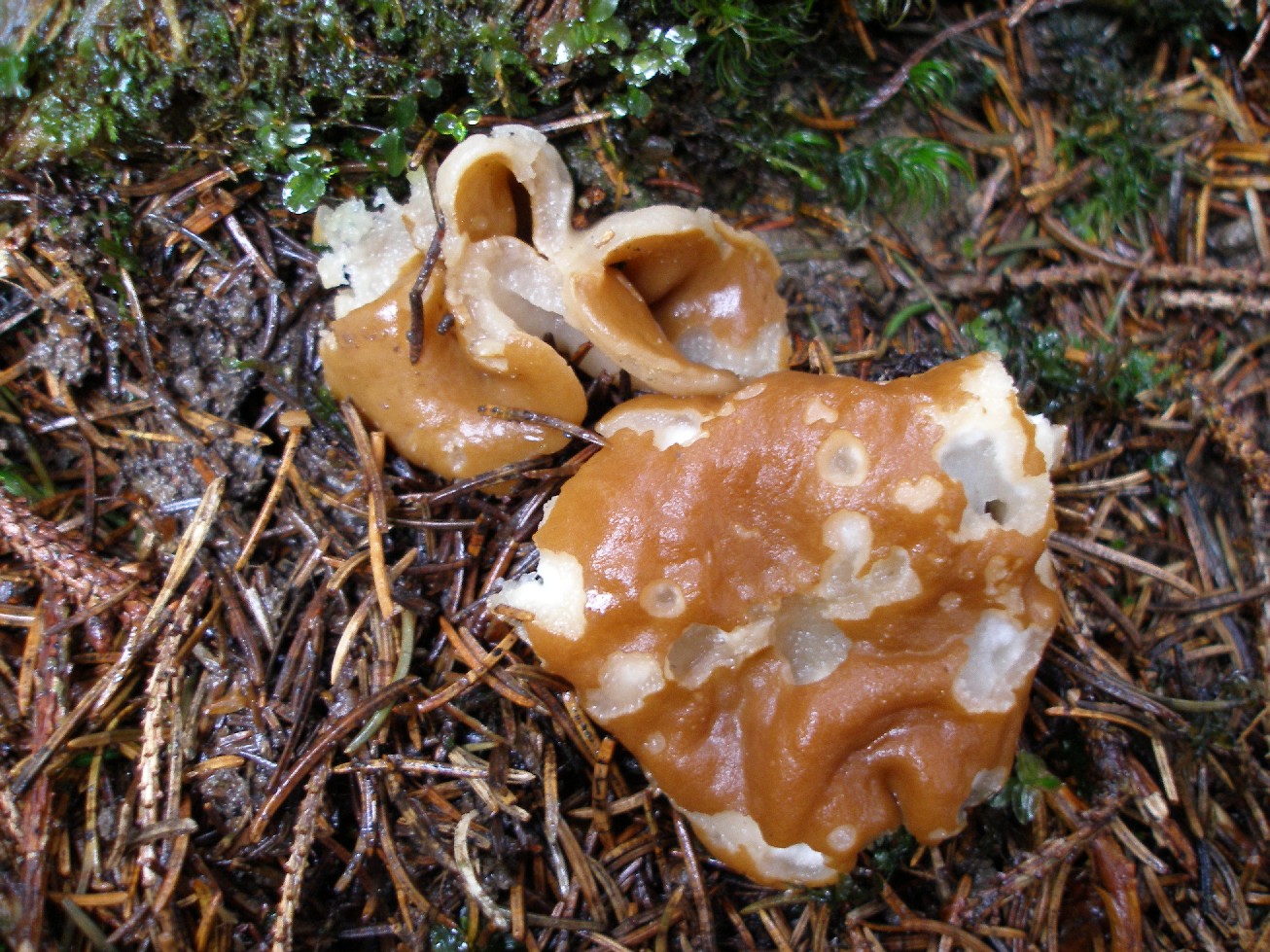 Auf dem Parabock in Freiburg Ch auf ca 1300 m.ü.M in montanem Fichtenwald (kurz nach der Schneeschmelze) habe ich heute diesen Asco gefunden. Die Fruchtkörper waren kaum grösser als 5cm gross und höchstens kurzgestielt. Der Rand war bei den meisten Fruchtkörpern nach unten gebogen. Das Fleisch war zweischichtig, oben dunkel, unten hell und ca 0.2-0.5 cm dick. Die Pilze rochen nicht nach Chlor. Die Sporen waren hyalin, elliptisch und hatten 1-3 Tropfen. Die Sporenoberfläche war meines Erachtens glatt.