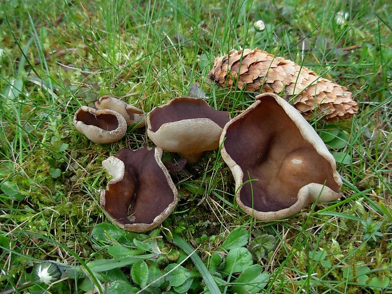 Wer kann mir bei dem Becherling helfen, gefunden in einem Garten mit viel Rasen und ein paar Fichten