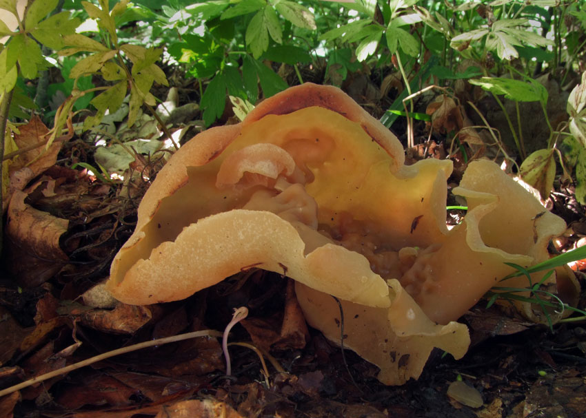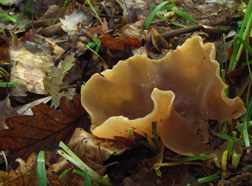 Wie vermutet ergab das scharfe Glas: Peziza arvenensis - Buchenwaldbecherling der Standort im Buchenlaub,