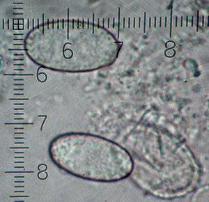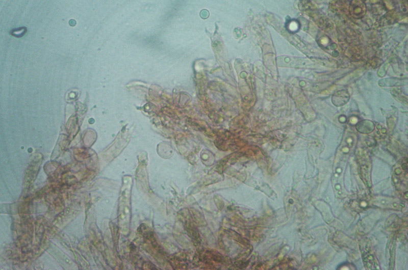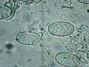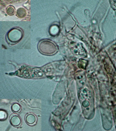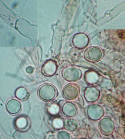 - 2 sporige Basidien, offene Bügelschnallen und hyaline, rundliche Sporen mit