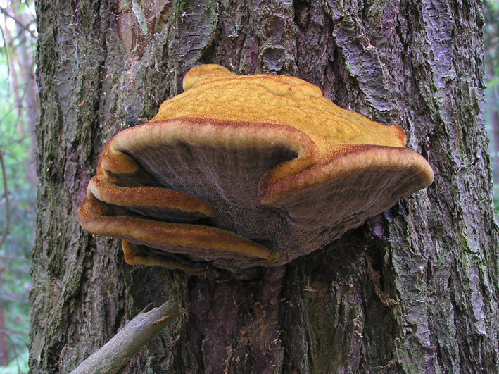 Meine erste Vermutung war Innonotus spec., er ist etwa 25cm breit, so kuschellig weich, wie er aussieht. Vorsichtiges Drücken mit dem Finger hat auf dem Hut deutliche Spuren hinterlassen. Er wächst an Fichte!!!!!!!! Damit dürften die Schillerporlinge schon mal ausscheiden. Oder es ist vielleicht doch Innonotus hispidus der beim Substrat fremdgegangen ist. Ich hoffe, ihr könnt mir helfen. Liebe Grüße