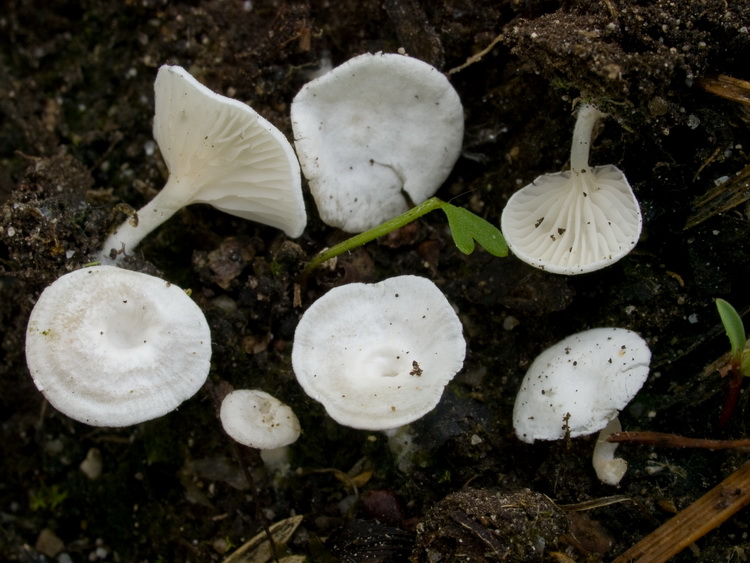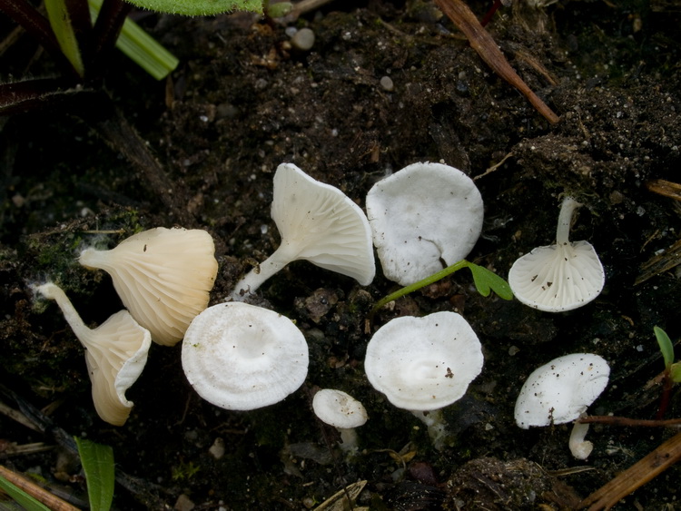 Funddaten: Fundort: MTB 7734-4-2-2, 480 m, Karlsfeld, Schwarzhölzl, auf einer kleinen Waldwiese, auf Erde zwischen Gräsern; gesellig (ca. 8 Fk); vergesellschaftet mit Hygrocybe persistens; Hut: bis 9 mm breit, schon jung flach ausgebreitet und nabelingsartig vertieft, alt Rand auch aufgebogen und etwas flatterig, trocken, matt, nicht gerieft, nicht hygrophan, mehlweiß, Oberfläche glatt, irgendwie bereift wirkend; Stiel: bis 4 x 1 mm, kurz, zylindrisch, basal gleichdick, bisw. verbogen, oft exzentrisch inseriert, weißlich bis cremefarben, weißlich bereift (Lupe!); Lamellen: mäßig gedrängt, untermischt, ca. 10 erreichen den Stiel, deutlich herablaufend, cremeweiß, alt satt cremefarben, Schneiden gleichfarbig; Fleisch: weiß, dünn; Geruch: unauffällig; Geschmack: mild, dann schwach bitterlich; Cheilozystiden: fehlend; Pleurozystiden: fehlend; Stieloberfläche: -; HDS: Trichoderm aus 2,5-5 µm breiten, zylindrischen Zellen, Endzellen zahlreich und mit abgerundeten Enden; Schn-; Basidien: vorwiegend 4-sporig, bisw. mit 2-sporigen untermischt, ohne Basalschnallen, ca. 19-23 x 7-7,5; Sporen: ellipsoid bis subamygdaliform, inamyloid, indextrinoid, glatt, hyalin, grünlich-körnelig gefüllt, ohne erkennbare Längsrippen (auch in der Aufsicht), oft (nicht immer!) dickwandig (an der Sporenwand mit zweiter Linie, könnte man mit viel Phantasie auch als Rippen interpretieren, 7,4 x 4 (6-9 x 3,5-4,5), Q=1,84 (1,56-2,25), 20 Sp. gemessen;