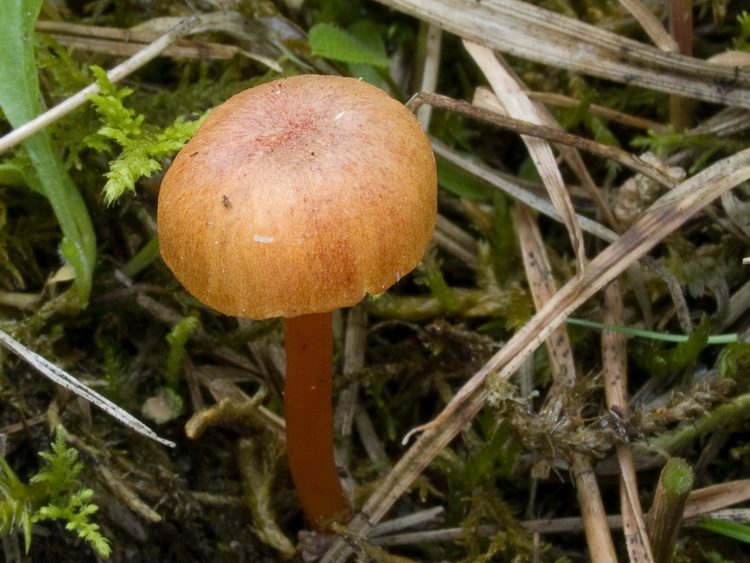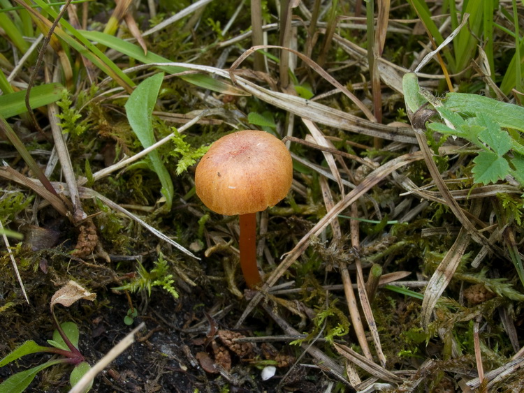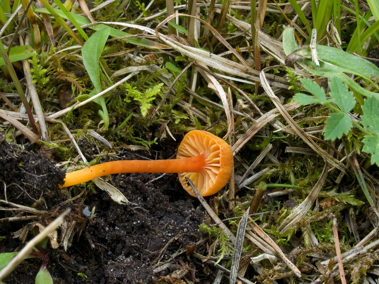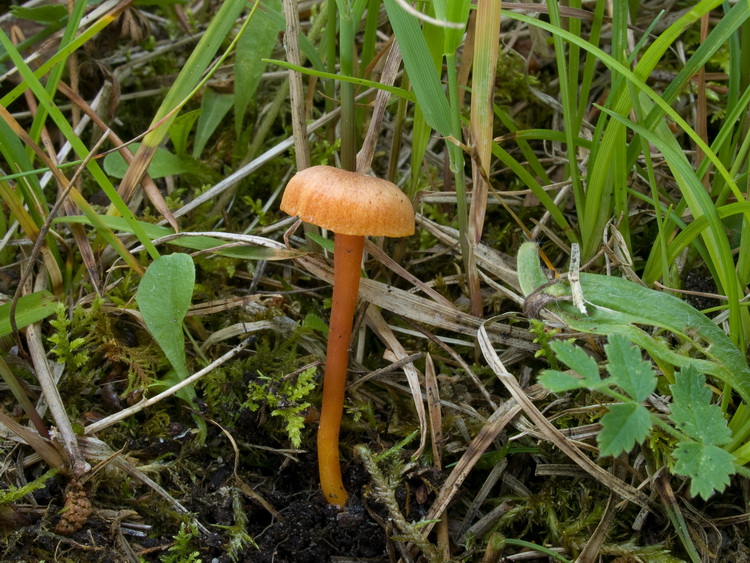 Fundort MTB 7734-4-2-2, 480 m, Karlsfeld, Schwarzhölzl, auf einer kleinen Waldwiese über Kalkschotter; Hut: 1,2 cm breit, gewölbt, schwach genabelt, im Zentrum filzig, sonst radialfaserig, völlig trocken, orangebräunlich bis orangeocker; Stiel: 30 x 25 mm, zylindrsich, nach oben hin schwach erweitert und abgeplattet, schwach längsfaserig, trocken (leicht wachsig), lebhaft orange, zur Basis hin etwas heller; Lamellen: schwach ausgebuchtet oder gerade angewachsen und mit Zahn herablaufend, eher entfernt (20 erreichen den Stiel), orangegelb; Fleisch: blass gelb, über den Lamellen wässerig orangebraun, in der Stielrinde kräftig orange; Geruch: unauffällig; Geschmack: mild; Cheilozystiden: -; Pleurozystiden: -; Lamellentrama: aus parallelen Hyphen, kurz septiert, Zellen zylindrisch bis spindelig, ca. 50-150 lang, ca. 15-22 breit; HDS: Cutis aus 4-10 breiten Zellen; Endzellen blass bräunlich pigmentiert und relativ schmal, kaum trichodermale Strukturen festgestellt; Basidien: 4-sporig, ca. 42-43 x 7-9; Schn+; Sporen: breitellipsoid bis subzylindrisch, sehr variabel geformt, aber nie eingeschnürt, 9,4 x 5,6 (8-11 x 5-6,5); Q=1,68 (1,45-2,00), 20 Sp. gemessen;