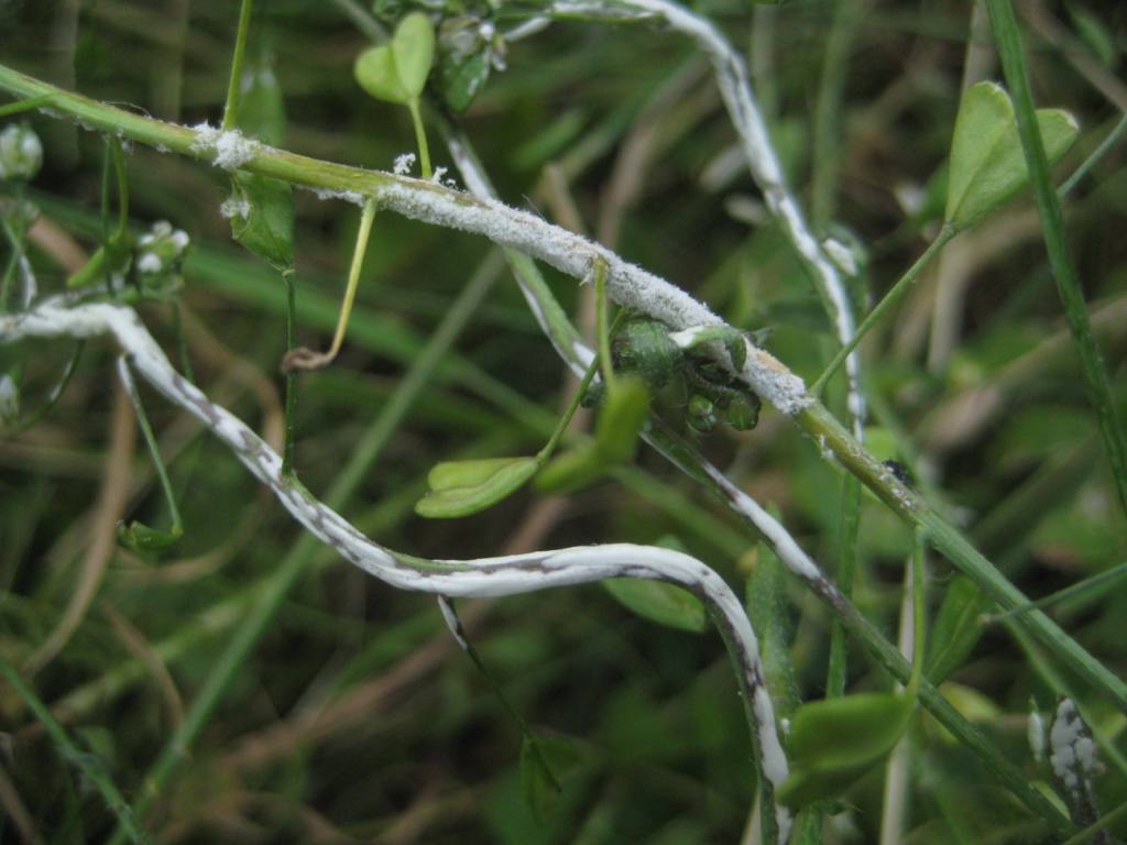 die Hirtentäschelkraut-Pflanzen an einem Ackerrand bei Durlangen (n. Schwäbisch Gmünd) sahen nicht sehr gesund aus. Wer kann das Foto richtig deuten?