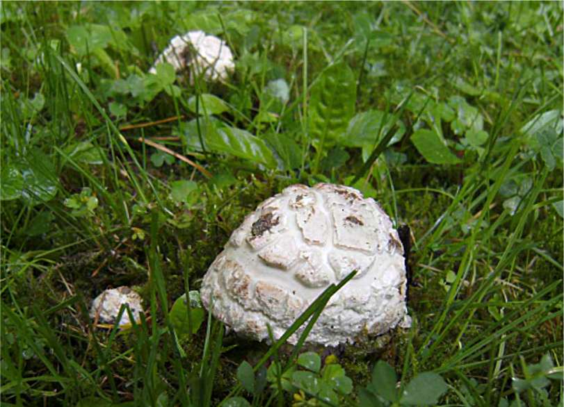 Für gestern hatte ich mir den Südfriedhof in Heilbronn-Sontheim ausgeguckt. Er liegt auf leicht geneigtem, hügeligen Gelände (meiner Erfahrung nach bekommt das dem Pilzreichtum etwas). Leider befinden sich auf ihm nur wenige Mykorrhizabäume: relativ viele Linden und noch einiges Andere (z. B. drei Douglasien). Auf noch relativ trockenem Geläuf fand ich dort ein Dutzend FK des Fransenwulstlings (siehe unteres Bild) - welche Mykorrhizapartner hat der eigentlich?, ein paar überständige, schon schwarze Kegelige Saftlinge, einige Mehlräslinge und einen deutlich gestielten Kartoffelbovist (Scleroderma spec.). Insgesamt also noch nichts Umwerfendes. Die nächsten Wochen und Monate müssen zeigen, was dieser Friedhof so alles kann.