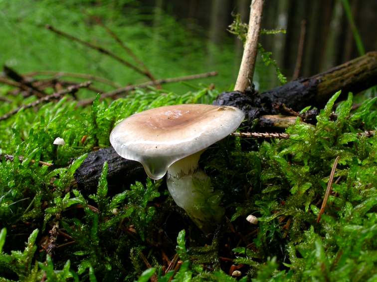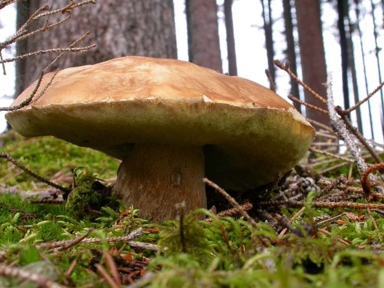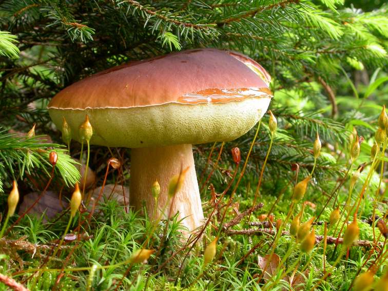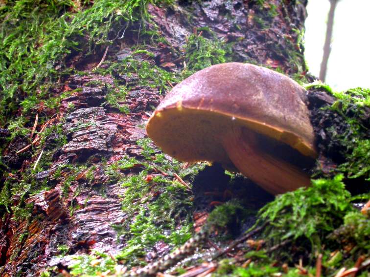 Ein Filzröhrling hat das Moospolster aufgeklappt: