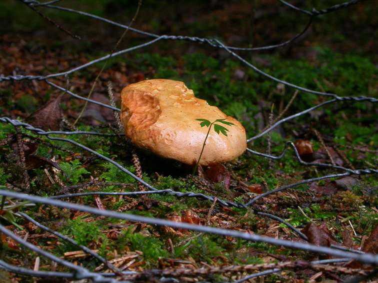Recht zerrupfte Pfefferröhrlinge stehen am Waldrand, wenn man durch einen Maschendrahtzaun wächst,