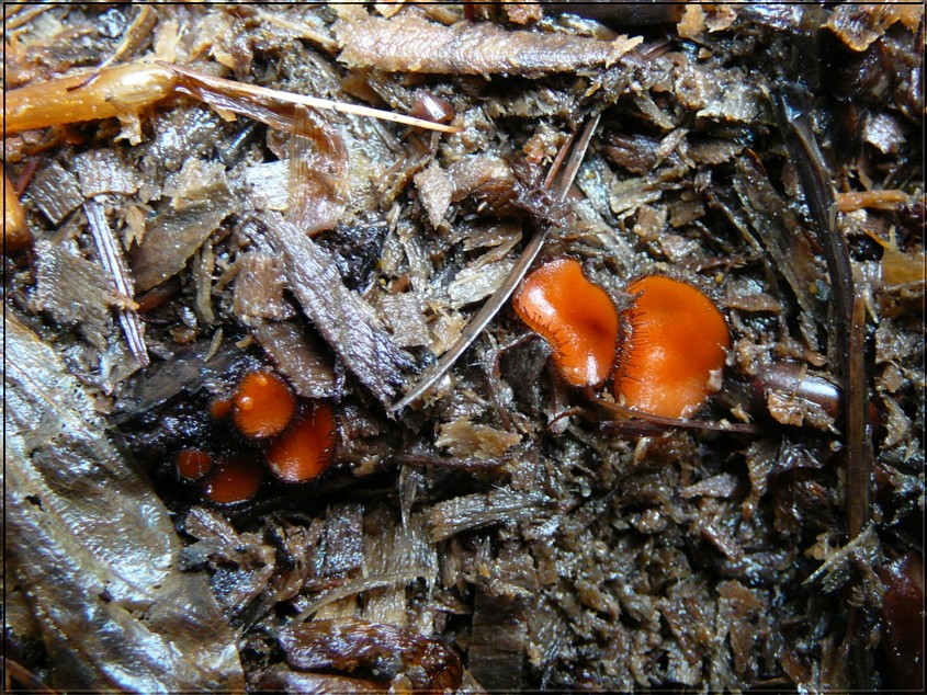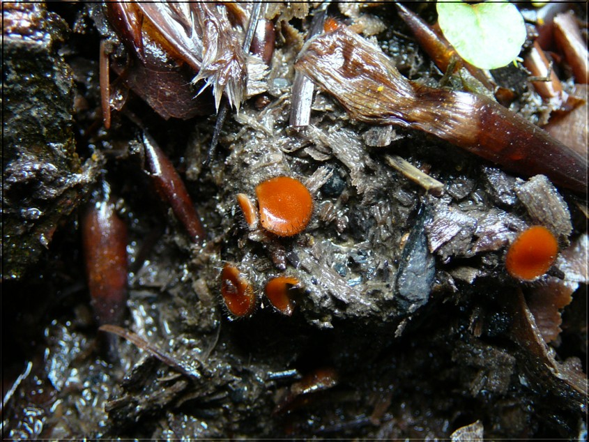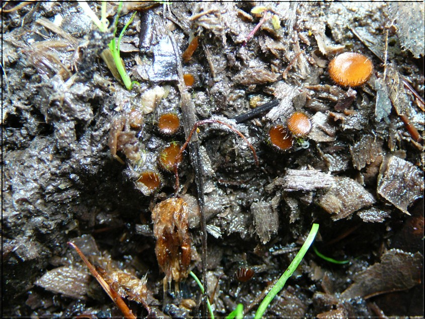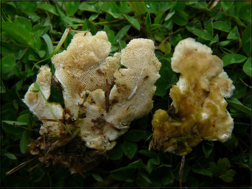 Wird wohl das Selbe sein. (Scutellinia scutellata?) Über diese bohnenförmigen Sporenform finde ich überhaupt nichts in meiner Literatur. Ich kann mir nicht vorstellen, das es eine optische Täuschung ist. Für Hinweise und Anmerkungen bin ich sehr dankbar. Dann habe ich noch auf einem Wiesenweg (Kalksandstein), ohne erkennbare Verbindung mit Holz, diesen Porling gefunden: