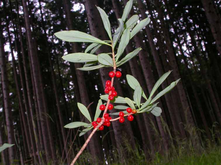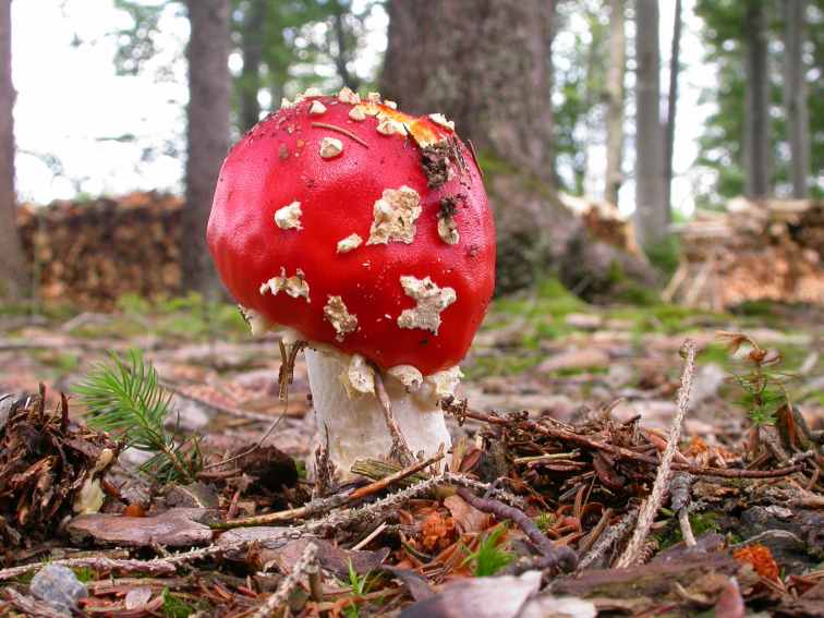 Die Seidelbastbeeren konkurrieren mit dem Rot des Fliegenpilzes.