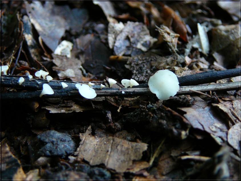 Hymenoscyphus spec. ? in Massen, an dünnen Ästchen auf verbrannter Waldstelle, Eschen-Ahorn Hangwald
