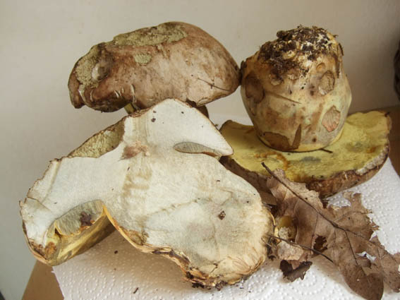 Der Pilz bläut beim Anschneiden. Stiel und Poren sind gelb, die Huthaut olivenbraun. Ich habe ihn im Laubwald gefunden. Er hat keine Stielspitze.
