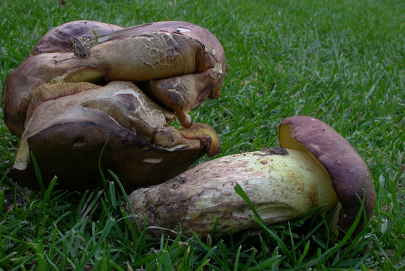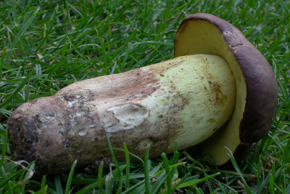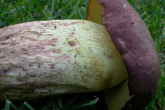 Die Röhren blauen beim anfassen, das Fleisch im Schnitt nicht. Das Netz an der Stielspitze ist gelb und der Hut rot-braun. Kann das der Anhängsel-Röhrling (Boletus appendiculatus) sein ? Dann gab es wieder einen im Garten. Dieser stand unter Fichte / Kirsche.