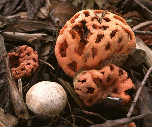 Lieber Wolfgang, das Bild habe ich nicht heute ergoogelt, sondern schon vor ein paar Jahren, da ich einen Vortrag über Pilzblumen gehalten habe. Ich glaube aber schon, das die Struktur schon bei jungen FK zu erkennen ist, wenn auch schwächer. Dies hängt mit der inneren Struktur zusammen, die ebenfalls Wabenförmig ist. Mikroskopisch geht zwar wenig, aber C. archeri hat größere Sporen - 8,5 µm und C. ruber nur bis 6 µm. (Pegler et. al.) Ich hänge dir mal noch zwei Fotos an. 1 Foto auch bei dem jungen Ei Struktur erkennbar.