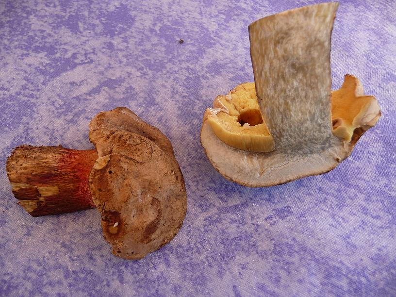 Beim ergiebigen Rundgang am Wochenende(Steinpilze) habe ich auch mehrere Exemplare von diesem gefunden. Ich schwanke zwischen Rotfußröhrling(säuerlicher Geruch) oder Schönfußröhrling(genetzter Stiel). Ansonsten sind die zwei sich ja recht ähnlich.