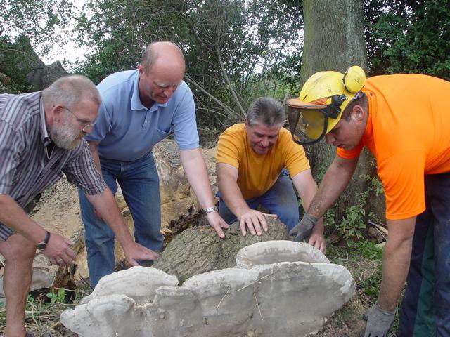 Ein Feuerwehrmann der FFW Lostau hat einen Teil des riesigen Eschenbaumschwamms aus der gefallenen Esche herausgeschnitten.