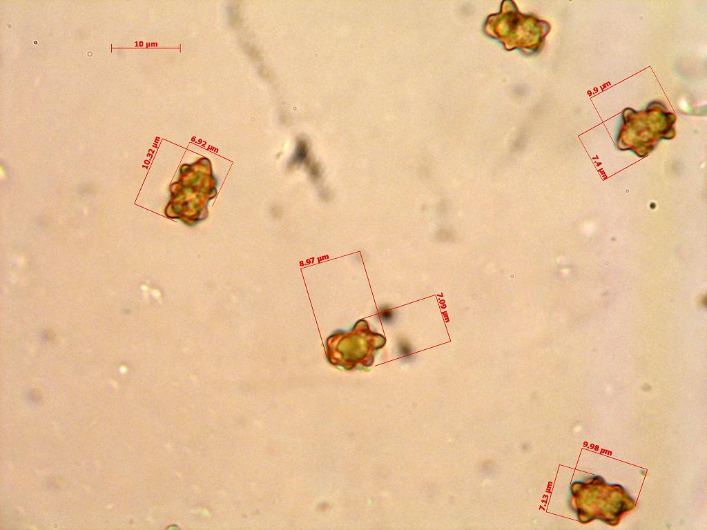 Um einen Status Quo zu erzeugen, werde ich also alle Aufnahmen mit dieser bei meiner Kamera maximalen 3-fachen Vergrößerung machen. Zwischenwerte wären zwar schöner, aber da wüßte ich ja nie, welche Vergrößerung ich gerade habe. Anbei noch mal ein Bild mit dem 63er Objektiv ohne Ölimmersion. Ich werde demnächst mal den Test machen, ob zum Messen wirklich 100er nötig ist. Mal sehen wie groß der Fehler ist.