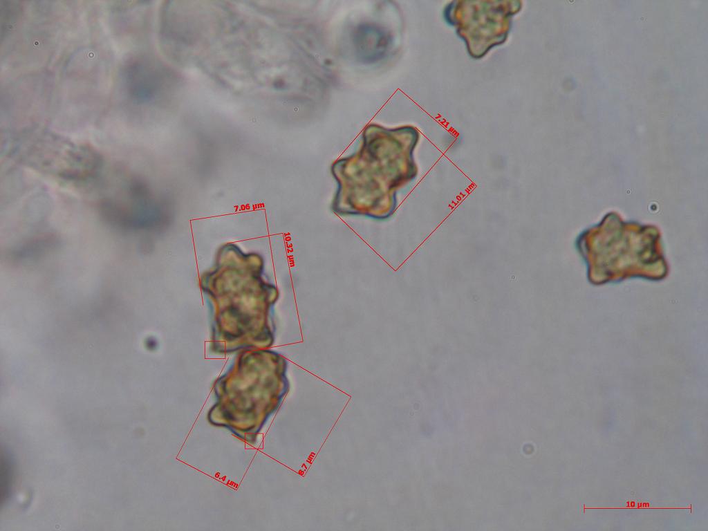 Hallo Andreas, Ich habe nochmal ein anderes Sporenbild genommen und um die wahrscheinlichen Appendix-Ecken ein kleines Kästchen gemacht (die beiden linken). Also sollte ich nur die beiden zum Messen benutzen?