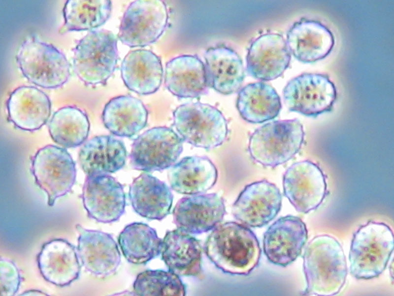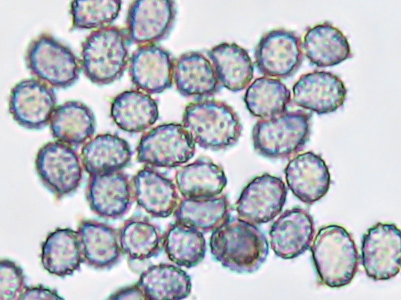 Ich dachte auch diesmal an R. vesca, bei dir waren auch einige Fruchtkörper zu finden, wo die Lamellen nicht über dem Hutrand ragten. Allerdings glaubte ich bisher die R. vesca zu kennnen und deshalb meine Bedenken, nicht nur wegen der Sporenfarbe sondern auch wegen der sehr zahlreichen Lamellen... R. decipiens? - es könnte vielleicht sogar hinkommen. Den Geschmack fand ich zwar mild, ich kaute ziemlich lange, ich habe einige dieser Täublinge sogar gebraten und gegessen - der Geschmack war so OK, allerdings bei weitem nicht so gut wie R. cyanoxantha (die ich gleichzeitig gebraten hatte). Da ich den Sporenabwurf aufbewahrt habe, hier gerade frisch erstellten Sporenbilder - das erste Bild im Durchlicht, das zweite im Phasenkontrast, jeweils im Melzer. Die Sporengröße: 8,1x6,2µm (7,3-9,1)x(5,6-6,5), die Warzen ragen teilweise um mehr als 1 µm.