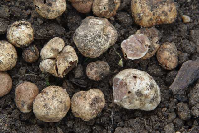 Liebe Hypogäen-Freunde, diesmal muss ich mich mit einer Frage an Euch wenden. Beim Umgraben des Salatbeetes kamen weissliche Knollen von bis zu etwa 3 cm zutage, die sich als Vertreter der Gattung Tuber erwiesen. Nach meiner spärlichen Literatur dazu müsste es sich um Tuber borchii handeln. Die Dichte des Netzes auf den bis zu ca. 50 µm langen Sporen schließt Tuber magnatum aus. Aber könnte es sein, dass noch eine weitere ähnliche Art existiert? Im Anhang ein Foto der Fruchtkörper, Mikrofotos folgen. Gruß Helmut