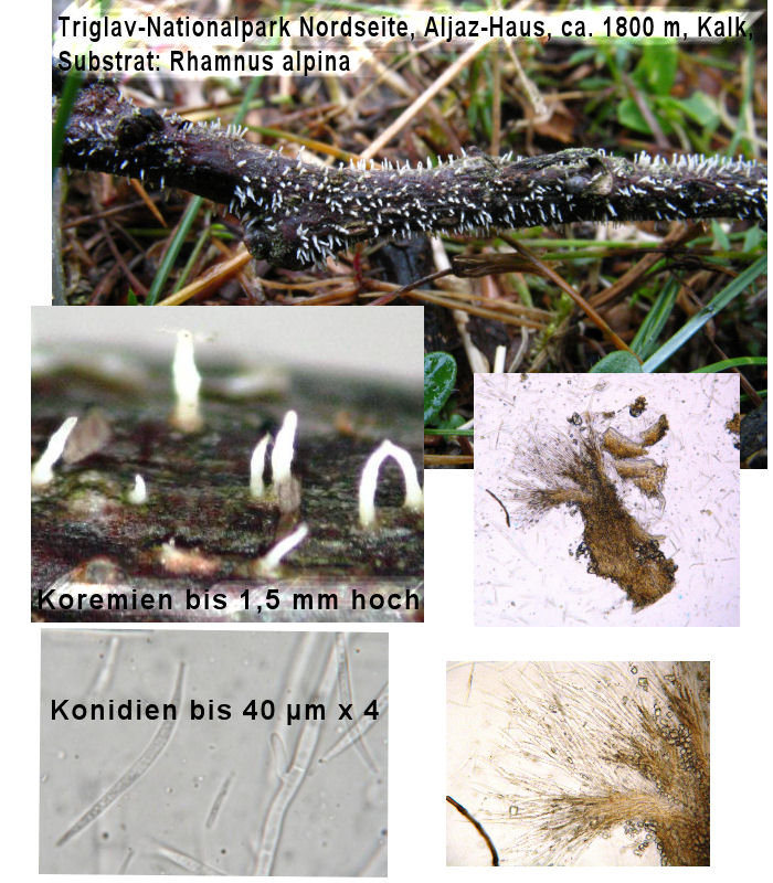 Hallo allerseits, kann mir vielleicht jemand helfen? Anfang August in den Julischen Alpen, Triglav-Nationalpark, Zugang zum Luknja-Pass auf Meereshöhe ca. 1800 m waren Rhamnus-alpina-Äste (noch am Busch) mit auffälligen Rasen eines weißen, koremienbildenden Imperfekten bedeckt. Anbei ein Bild. Geblätter im Ellis und im Barnett hat leider nix ergeben :-( Auffallend war übrigens auch die starke Besetzung der Koremien mit Kristallen. Die Konidien waren bis 40 µm lang und hatten am oberen und unteren Ende eine "knöpfchenartige" Struktur. Bin schon sehr gespannt..... Hermine