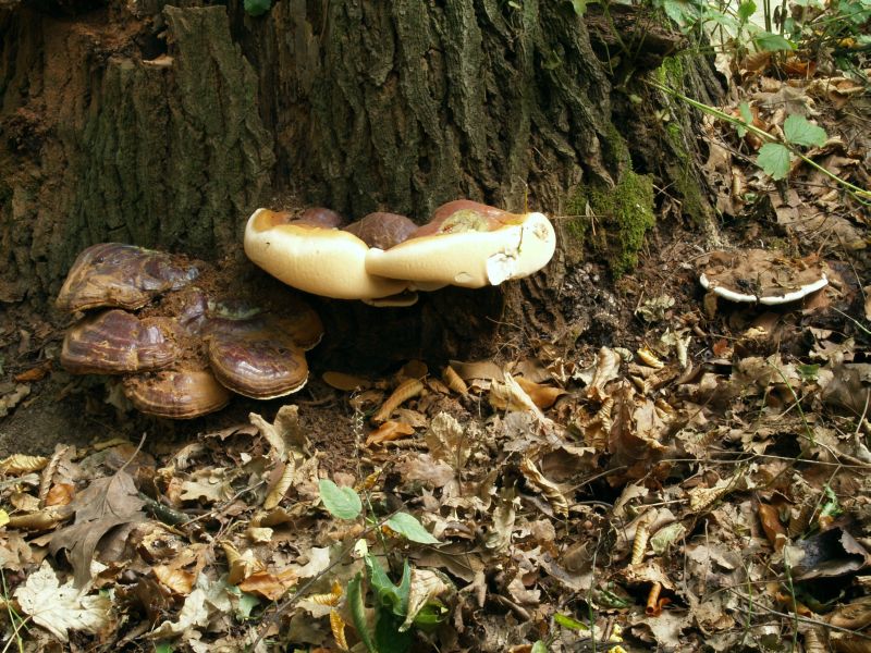 Ganoderma pfeifferi, resinaceum und applanatum am gleichen Eichenstumpf.