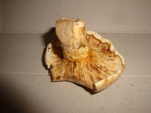 Hallo Hartmut! Nachdem meine Probe schon ein wenig trocken geworden war, habe ich heute die Gelegenheit zur KOH-Probe gehabt. Dies ergab nun eine anständige Färbung des Fleisches zuerst gelb, dann orange. Bei einem sehr ähnlichen weißen haben wir das auch probiert. Der war noch frisch und milchte stark. Eine Reaktion des Fleisches und der Milch erfolgt hier nicht. Hier im Bild.