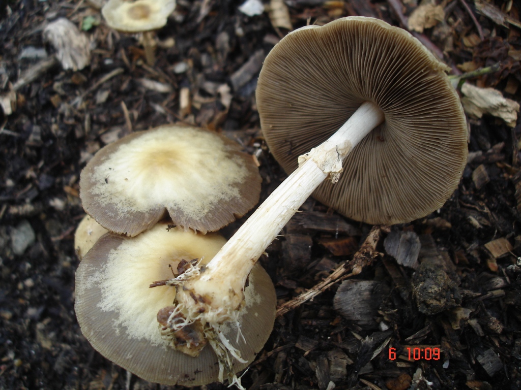 Hallo, hier kommt ein Hilferuf aus Wermelskirchen: auf einem großen Haufen Häckselgut habe ich letzte Woche in Massen den abgebildeten Pilz entdeckt. Die Art des Holzes war nicht zu bestimmen; der Pilz wuchs rasig; das SPP war dunkel/tabakbraun. Ich denke, es ist ein Agrocybe, aber sicher bin ich mir nicht. Kann mir jemand bei der Bestimmung helfen? Vielen Dank schon im Voraus! Herzliche Grüße,