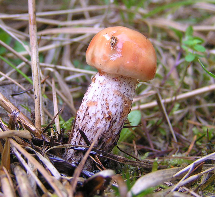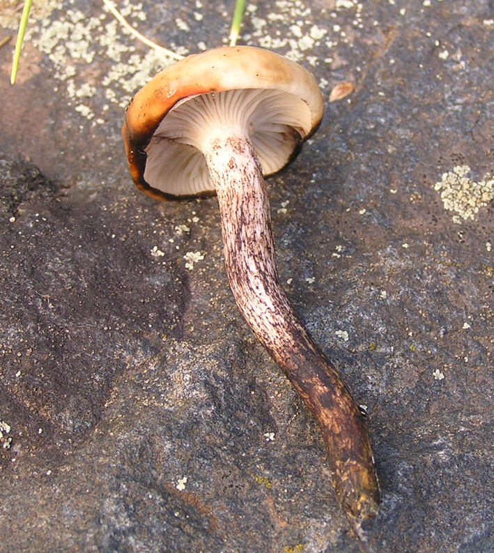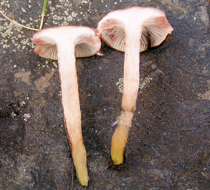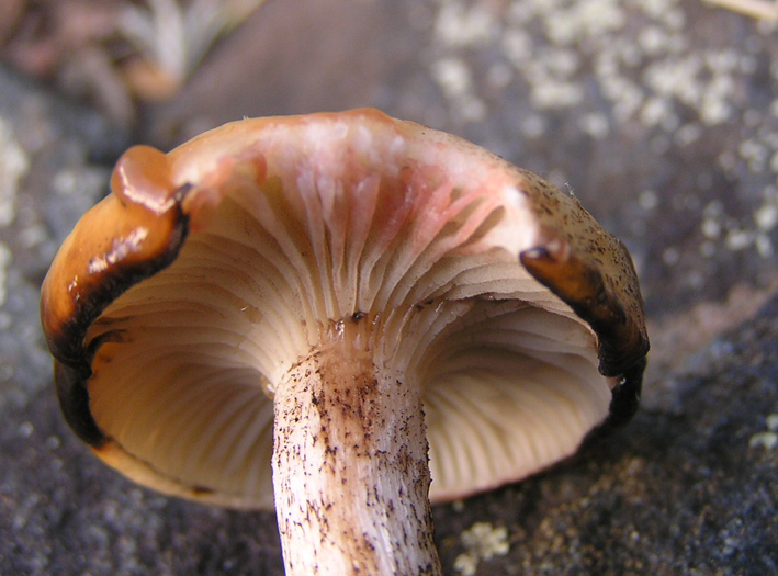 Der kupfer-rötliche Schleim auf denm Hut sitzt auch in kleinen Tröpchen auf dem Stiel und färbt diesen anscheinend schwarz, ebenso, wie das Gras darunter. Bei dem mitgenommenen Pilz war der Schleim schon größtenteils abgelaufen. Die Huthaut war darunter eher hellocker, immer noch gelatinös. Die Stellen an denen der Schleim sich duch das Liegen im Behälter gesammelt hatte, wurden schwarz.