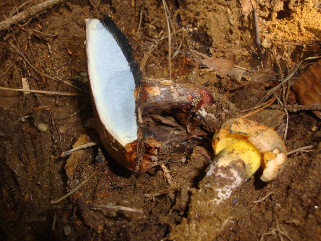 Die zwei wuchsen nicht einmal 15 cm voneinander entfernt. Der eine hat einen glatten braunen Hut und blaut gewaltig. Porenboden ist rot. Die Poren waren schon zu alt. Der Stiel glatt. Der andere hat einen gelben verlängerten Stiel mit einem hellen Hut und blaut wo man ankommt. Die Poren sind gelb.