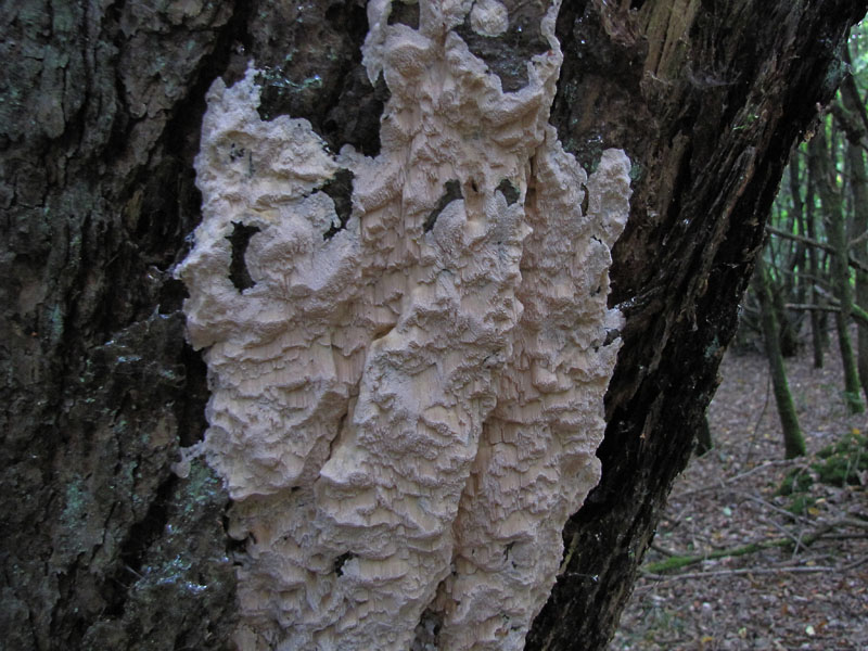 Neben den Bekannten auch diesen (bisher) resupinat wachsenden Porling auf und unter der Rinde eines knapp einsfünfzig Meter hohen, morschen Kiefernstumpfes, auffallend großflächig, lachsfarben-orangelich (wenn mich das Dunkel im Wald und das Kunstlicht zu Hause nicht täuschen...).