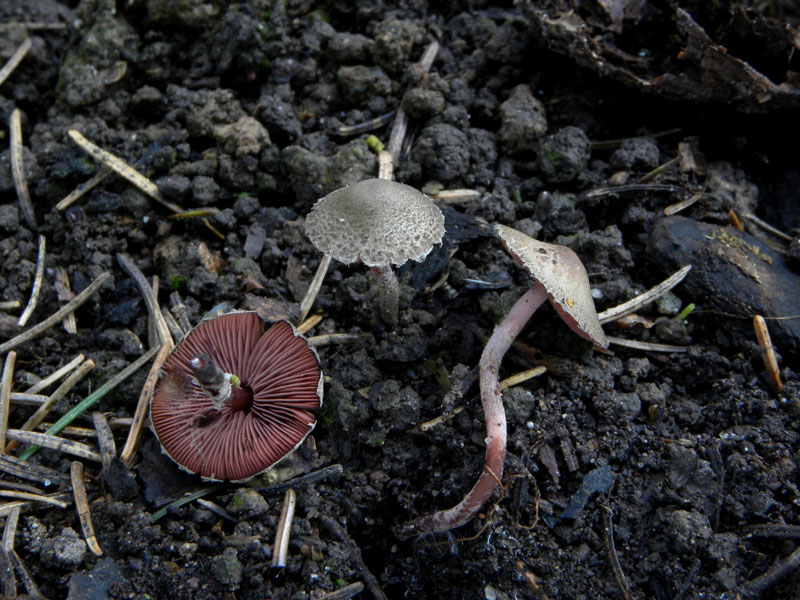 Sollte der Blutblättrige Zwerg-Schirmling - Melanophyllum haematospermum sein.