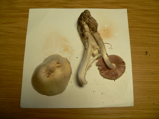 ich wollte eigentlich nur schauen, was aus einem Riesenporling auf einer Wiese geworden ist. Da stand an dem Baumstumpf ein weißer Pilz, mit dem ich erst mal gar nichts anzufangen wusste. Also mitnehmen und mal aussporen lassen.