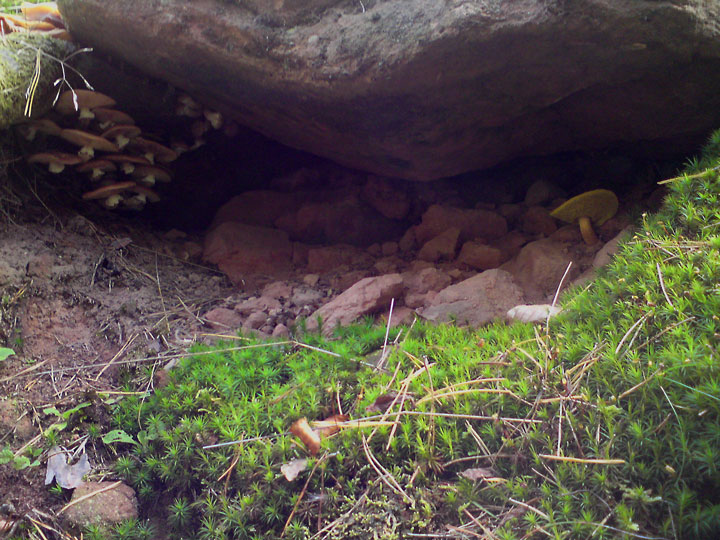 es ist eine Marone. Hab sie auch nicht gleich entdeckt, da ich mir zuerst die Höhlenpilze betrachtet hatte. Foto leider unscharf. Links Hallimasch und rechts wieder eine Marone. Jetzt war es doch schon so trocken und dann suchen die sich so ne Steinwüste aus. Verstehe einer die Pilze. ;-)