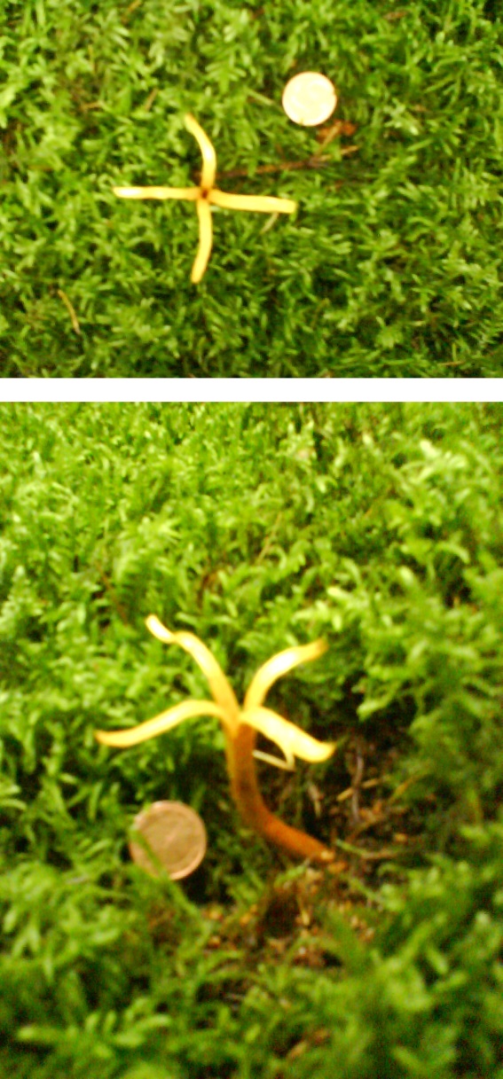 Leider hatte ich keinen Fotoknips mit nur mein Handy - die Bilder sind dementsprechend. Leider etwas unscharf, aber der "Pilz?" ist so auffällig, den erkennt man doch, oder? Hab für den Größenvergleich mal eine 1-Cent-Münze dazu gelegt.