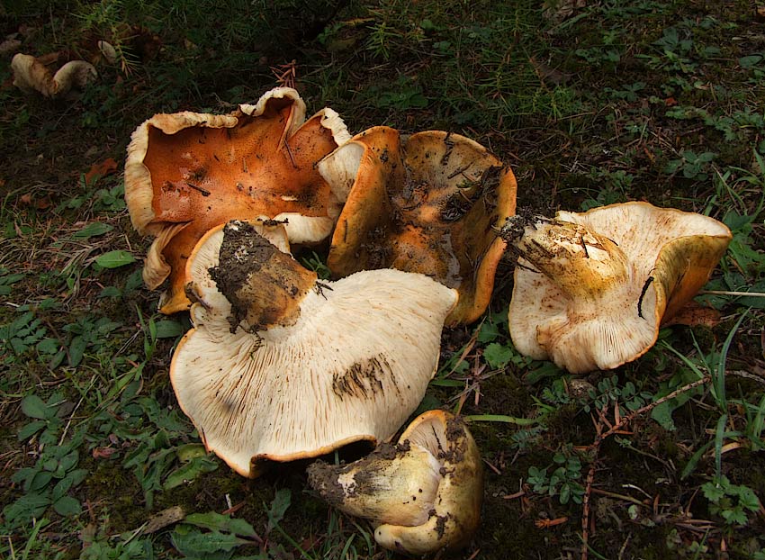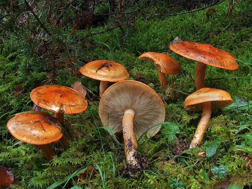 Eine Andere Fläche wieder bei Wacholder, eine Hammerkollektion von Tricholoma aurantium - Orangeroter Ritterling
