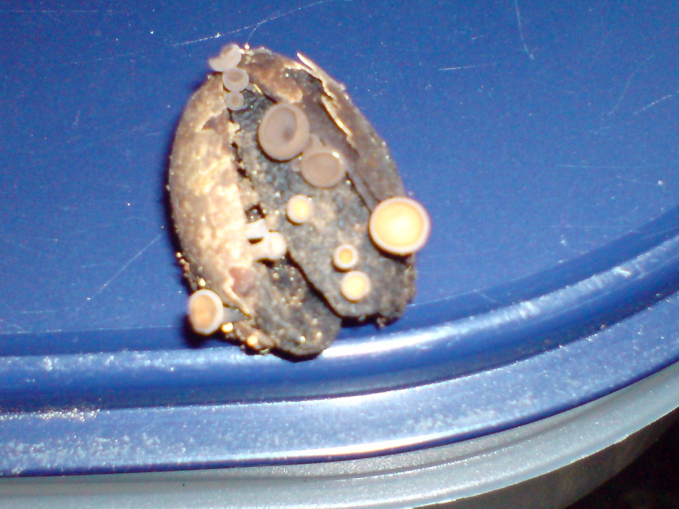 Hier ein Fund, der mir auch Rätsel aufgibt. Eine Schülerin fand diese Eichel mit Pilzen darauf und darin.