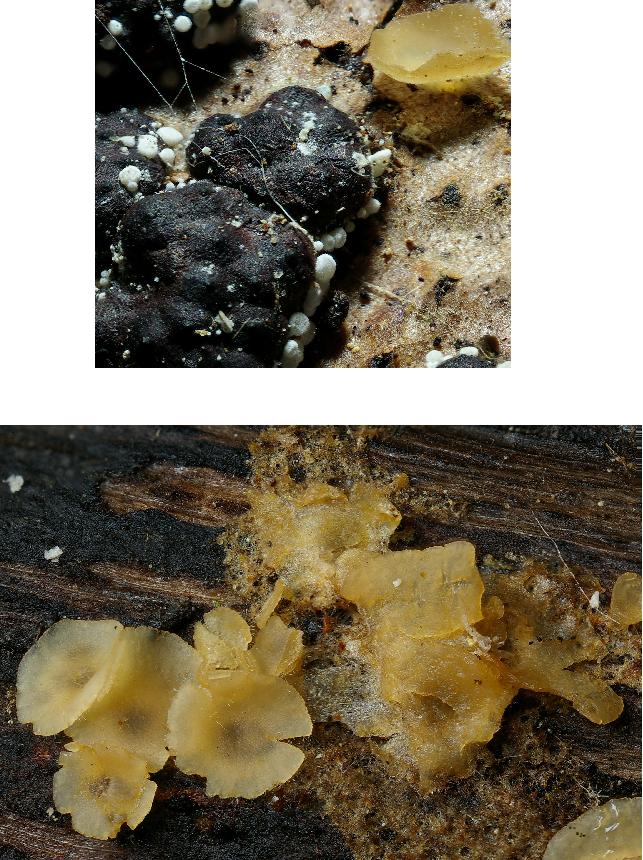 auf einem Buchenast fand ich diese drei Pilzchen, der Weiße und der Schwarze bereiten mir keine Probleme, aber den Gelben kann ich nicht einordnen.