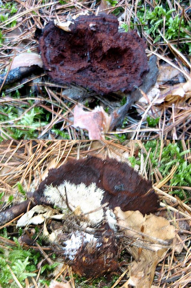 Hallo Pilzkenner Habe heute morgen im Kiefernwald u.A. eine Pilzruine gefunden. Sie hatte direkten Bodenwurzelkontakt (kein Baumstamm-Pilz) und ist leicht und verholzt . Nach meinen Büchern käme sie einem vergammelten Kiefern-Braunporling am nächsten. Was meint Ihr? Bin nicht sicher. Gruß aus dem Pfälzerwald