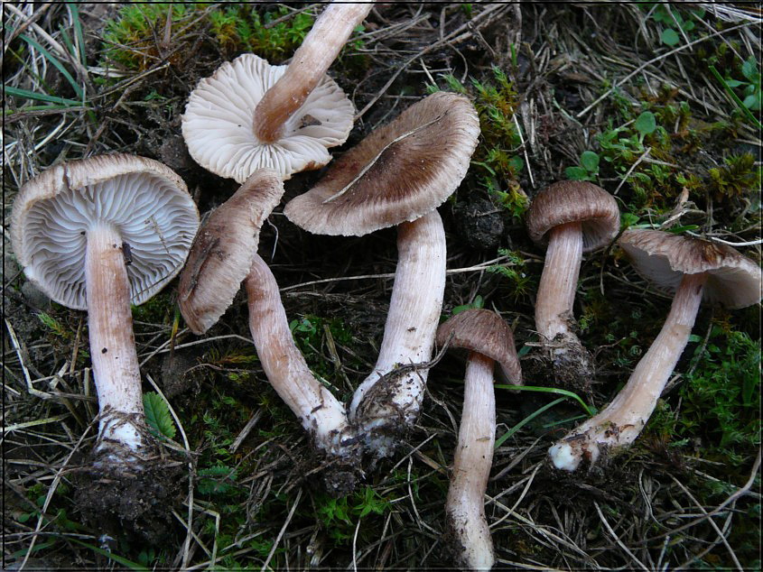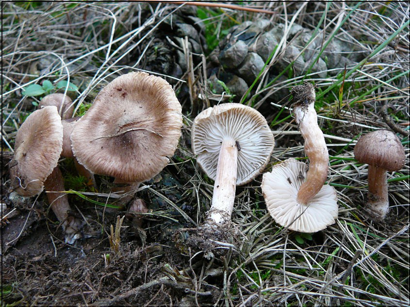 Inocybe spec. gefunden inmitten Felderstern und Scheibenbovist, Sandstreifen, ca. 5m Entfernung Schwarzkiefern. Auffällig die weißen Blätter, Hut und Stiel braun rosa, schön gefärbt.