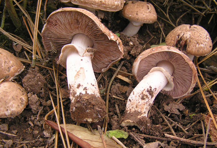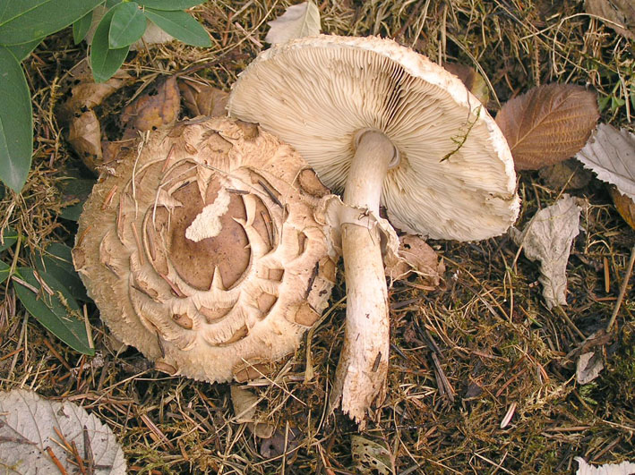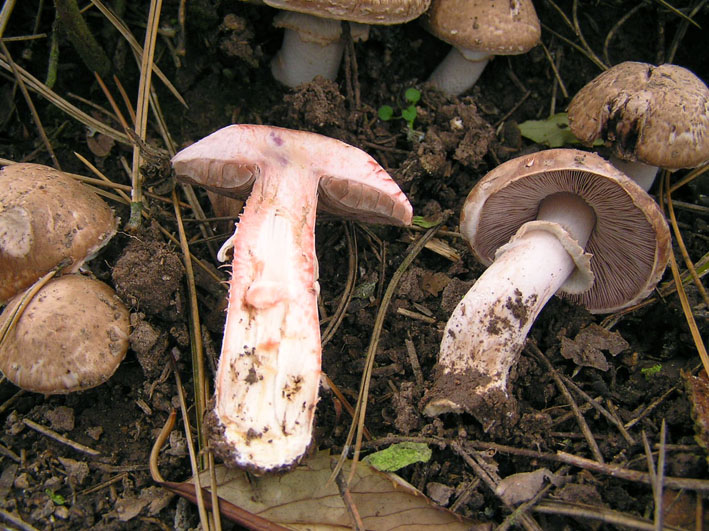 Tata!! Jetzt haben wir eine Neuerscheinung. In einer Ecke, in der noch nie ein Pilz wuchs, rechts ein Schwarzkiefer, links eine Omorika-Fichte, da dürfte er sich wohl wie im Nadel-Wald gefühlt haben. Meine Vermutung: Agaricus silvaticus, der Kleine Blut-Egerling oder Wald-Egerling.