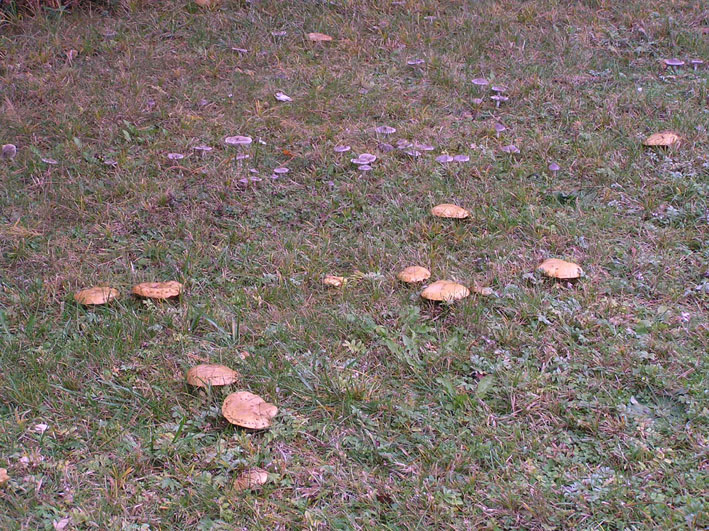 Das ganze Jahr über hat mein Garten seinem stolzen Namen wenig Ehre gemacht. Im Sommer gab es drei oder vier Wiesen-Egerlinge, etwa vier unbestimmte Psathyrella-Arten. Dann im September einige Kupferrote Gelbfüße, eine Gruppe Körnchen-Röhrlinge (Suillus granulatus) an der gleichen Stelle, an der sie im letzten Jahr zum ersten Mal erschienen und einige Ringlose Butterpilze an einer Stelle, an der noch nie welche waren. Ach ja, natürlich noch Vascellum pratense, der Wiesenstäubling, aber der ist fast das ganze Jahr über immer mal mehr oder weniger präsent.