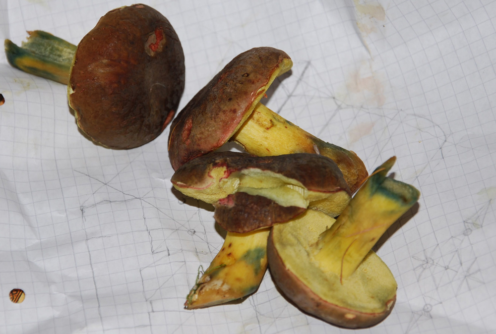 Die blaue Färbung tritt nur leicht und sehr langsam auf (im Gegensatz zum Boletus erythropus [Schusterpilz]).