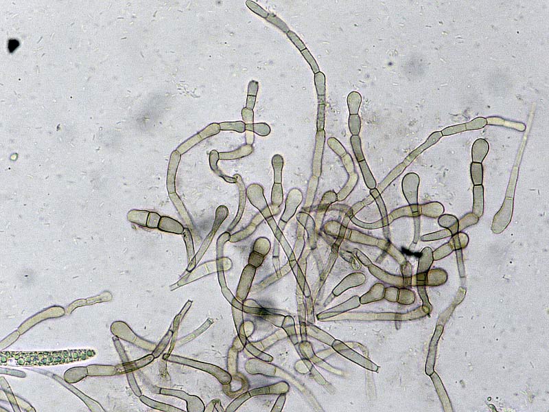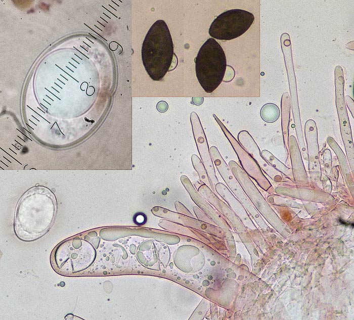 Die Innenseite der Borstlinge war mit kleinen schwarzen Pocken bestückt, was sich auch im Mikrobild zeigte: Immer wieder dunkle spindelige "Fremdkörper(-Sporen?)" im Bild.