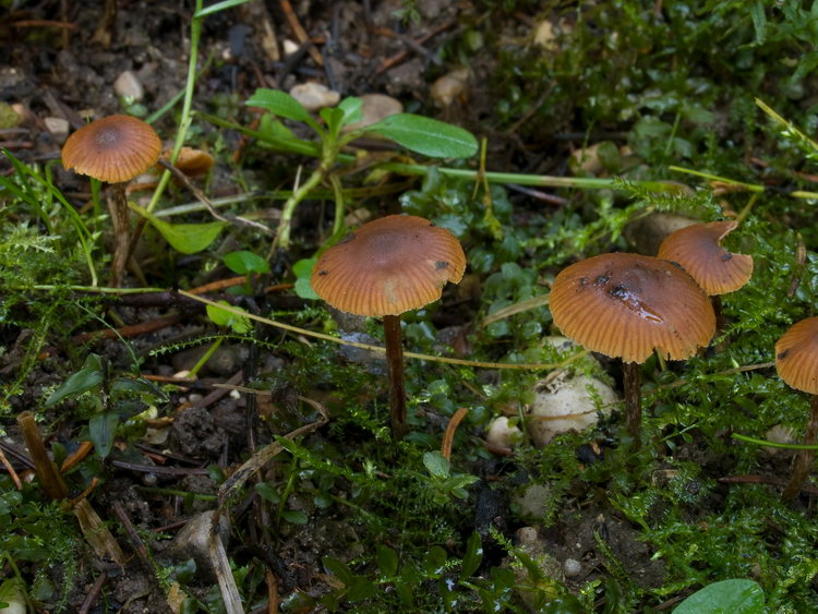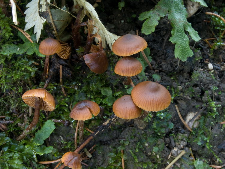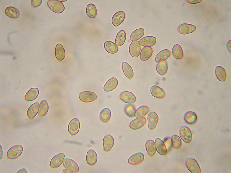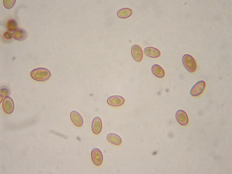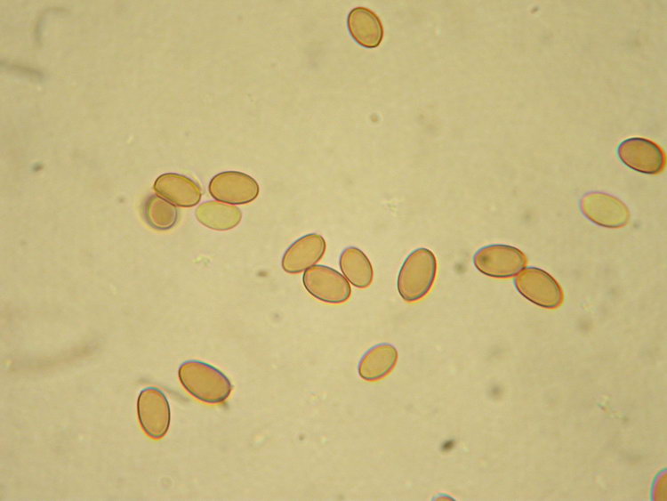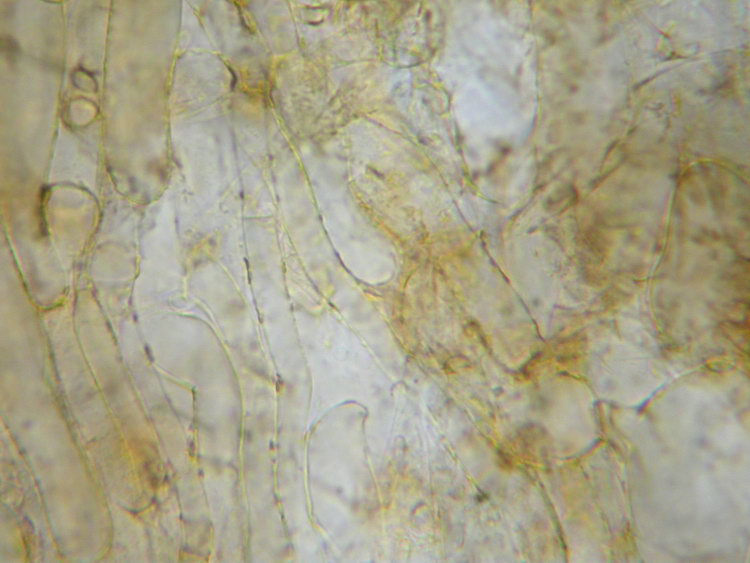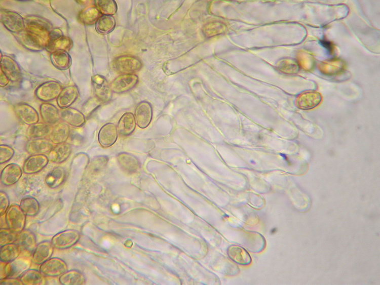 Makroskopisch sehen die Pilzchen wie eine Galerina aus. Die dunkel honigbraunen, bis zum Scheitel gerieften Hüte ohne Velum und relativ dunklen Stiele sind sehr typisch. Vielleicht hat sie jemand von euch schon mal so gesehen. Ich glaube nicht, dass die Art selten ist, da wir sie letztes bzw. vorletztes Wochenende jeweils auf einer Ruderalstelle im montanen Fichten/Tannenwald auf Erde gefunden haben. Als Galerina kriege ich diese Schwammerln nicht geschlüsselt und ich bin mir auch gar nicht sicher, dass es eine Galerina ist, denn die Sporen sind sehr blass ocker, völlig glatt und meiner Einschätzung nach nicht dextrinoid. Sie sind regulär ellipsoid bis deutlich mandelförmig und ergeben zusammen mit den zylindrisch-welligen bis kopfigen Cheilozystiden eher das mikroskopische Bild einer Tubaria. Wer weiß, vieleicht müsste man in einer dritten Gattung suchen? Nun noch eine Beschreibung und ein paar Mikrofotos: Funddaten: MTB 8135-2-4-4, 690 m; Kleinhartpenning, Buch, im Fichten-Tannenwald, an der Böschung einer Fahrspur, auf Erde; gesellig bis kleinbüschelig (10 Fk); Hut: bis 2 cm breit, jung halbkugelig, später flach gewölbt und meist mit deutlich abgesetztem, rundlichem Buckel, trocken, matt, bis zum Scheitel durchscheinend gerieft, dunkel honigbraun bis kastanienbraun, am Scheitel bisw. schwarzbraun; hygrophan, ockerbraun ausblassend; Stiel: bis 37 x 2,5 mm, zylindrisch, schlank, basal gleichdick oder schwach erweitert, gerne etwas exzentrisch inseriert, apikal bereift bis beschürfelt, stielabwärts weißlich überfasert, meist +/- hutfarben, zur Basis hin dunkler, bis schwarzbraun; Lamellen: aufsteigend und breit angewachsen, mäßig gedrängt (>20 erreichen den Stiel), ockerbraun bis haselnussbraun; Schneiden konvex, weißlich beflockt; Fleisch: cremeocker und bräunlich marmoriert, in der Stielspitze oft wässrig dunkelbraun, im Hut dünn, Stiel voll!; Geruch: unauffällig; Geschmack: mild, +/- neutral bis etwas unangenehm ranzelig; Sporenpulver: 3a nach Gerhard, Nr 21 oder 27 in PDS; ockerbraun; HDS: Dünne Cutis aus 4-6 breiten Zellen, darunter dickere, hypodermartige Zellen (bis 30 breit), Pigment inkrustierend (ockerbraun), Schnallen vorhanden; Hutfleischzellen ca. 40-130 lang und bis 15 breit; Cheilozystiden: zylindrisch-wellig, bisweilen etwas kopfig oder schlank keulig, ca. 30-50 x 6-10, Schnallen vorhanden; Pleurozystiden: sehr sporadisch oder fehlend (?): lediglich in der Nähe der der Schneide findet man aus dem Hymenium herausragende Zellen, im Lamellenquerschnitt nur eine einzige sterile Zelle, die länger als die Basidien ist, gesehen (53x9); sonst sporadisch zystidenartige Zellen, die aber die Basidien kaum überragen; Lamellentrama: regulär, Zellen ca. bis 120 lang und 8-12 breit, schwach inkrustiert; Schn+; Basidien: 4-sporig, ca. 26-36 x 7-8; Schn+; Sporen: ellipsoid bis mandelförmig (an den Enden häufig verjüngt und auf der Apiculus-Seite breiter, bisw. auch regulär ellipsoid); völlig glatt, mäßig dickwandig; nicht dextrinoid; ohne KP oder Kallus; oft mit vielen Tröpfchen, in Wasser blass ocker; Maße: 8,5 x 5,4 (7,5-9 x 4,5-6), Q=1,58 (1,36-2,00), 20 Sp. gemessen; Cheilozystiden: