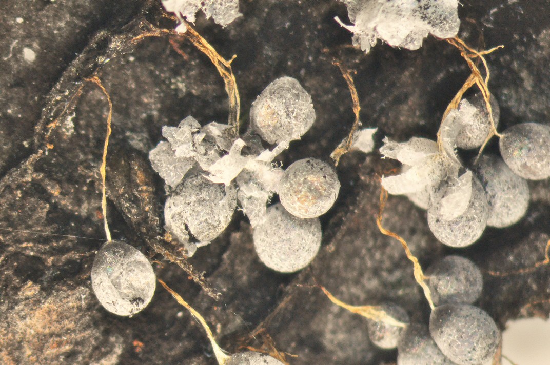 Was kann das für Schleimer sein? Die FK sind alle so langstielig (wahrscheinlich hängend) und fast immer mehrere gelbliche Stiele zusammen in sich verdreht. Die Köpfe sind etwas eiförmig und ca. 1 x 1,2 mm. Die einfache Peridie ist kalkhaltig, unregelmäßig aufreisend, grauweiß und ganz leicht irisierend. Das Capilitium besteht praktisch nur aus Kalk und bildet eine netzartige Struktur. Die Sporen sind -11 µm groß, braun, mittelmäßig warzig und ohne hellen Band. Viele der Sporen sind aber in der Mitte eingefallen. Kann das Badhamia foliicola oder doch ein alte B. utricularis, oder was ganz anders sein? Gruß Peter Bild 2 folgt