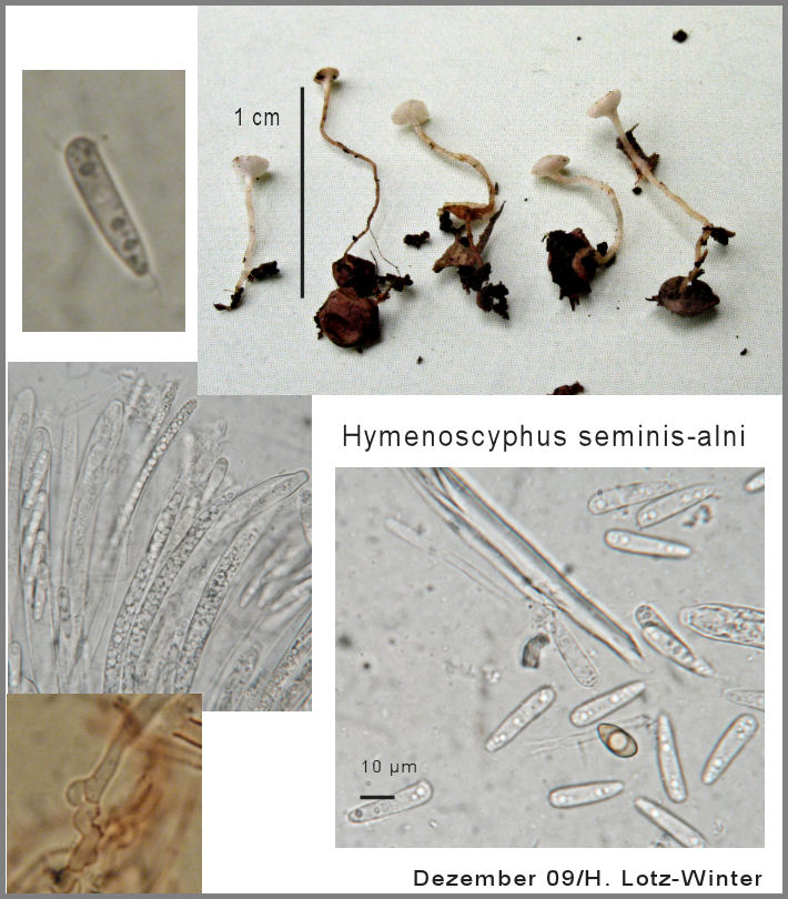 Hallo allerseits, spät im Jahr habe ich noch einen schönen Fund im Frankfurter Raum gemacht. An einem relativ wenig verschmutzten Bachlauf südlich von Offenbach, direkt an Erlen und zwischen den am Baumfuß an der Rinde hochwachsenden Moosen, jeweils noch in der Laubstreu, entdeckte ich zarte, weiße Becherchen. Die Stiele waren bis 1 cm lang, die Scheiben bis 0,3 cm breit. Die Stielchen waren tw. bräunlich überhaucht. Vorsichtiges Nachgraben ergab, dass die Pilze Erlensamen aufsaßen. Meine Fotos sind leider nicht so gut. Die Mikroskopie zeigte jedenfalls den typischen Hymenoscyphus: scutuloide Sporen bis ca. 20 x 4, mit viel Öl und - leider ebenfalls auf den Fotos nicht so gut sichtbar - mehreren Zilien an beiden Polen. Die Zilien waren bis ca. 5 µm lang. Die Sporen waren z.T. septiert. Die Paraphysen enthielten im oberen Teil (ca. 50 µm lang) sehr stark lichtbrechende,runde Einschlüsse. Die Asci zeigten eine graublaue IKI-Reaktion, mit einem strichförmigen Hymenoscyphus-Apparat und hatten Haken. Das Excipulum war prismatisch und mit Kristallen besetzt. Wer hat denn schon Hymenoscyphus seminis-alni von Euch gefunden? Ich meine, der wird nicht so oft berichtet, oder? Für mich war es ein Erstfund (allerdings kenne ich den vielversprechenden Bachlauf auch noch nicht so lange). Viele Grüße Hermine